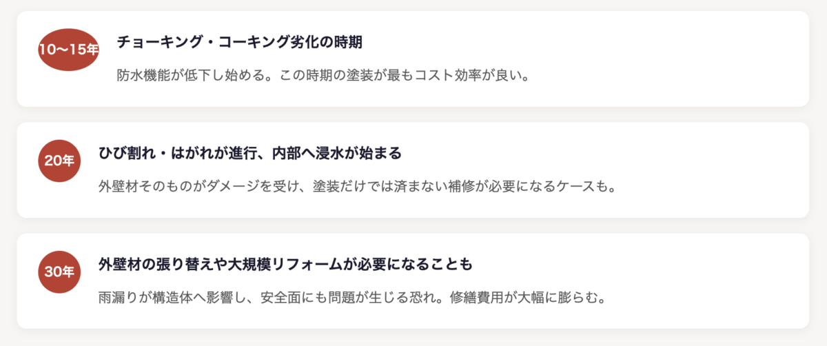 - 20年以上放置すると塗装だけでは対応できず、外壁張り替えなど高額修繕が必要になることも。